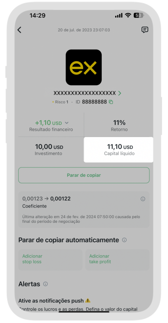 Esta seção apresenta um resumo do seu investimento e das ordens copiadas. As informações exibidas podem variar entre investimentos ativos e fechados. Para investimentos ativos, há um botão para parar de copiar, além das opções de adicionar um stop loss e um take profit.